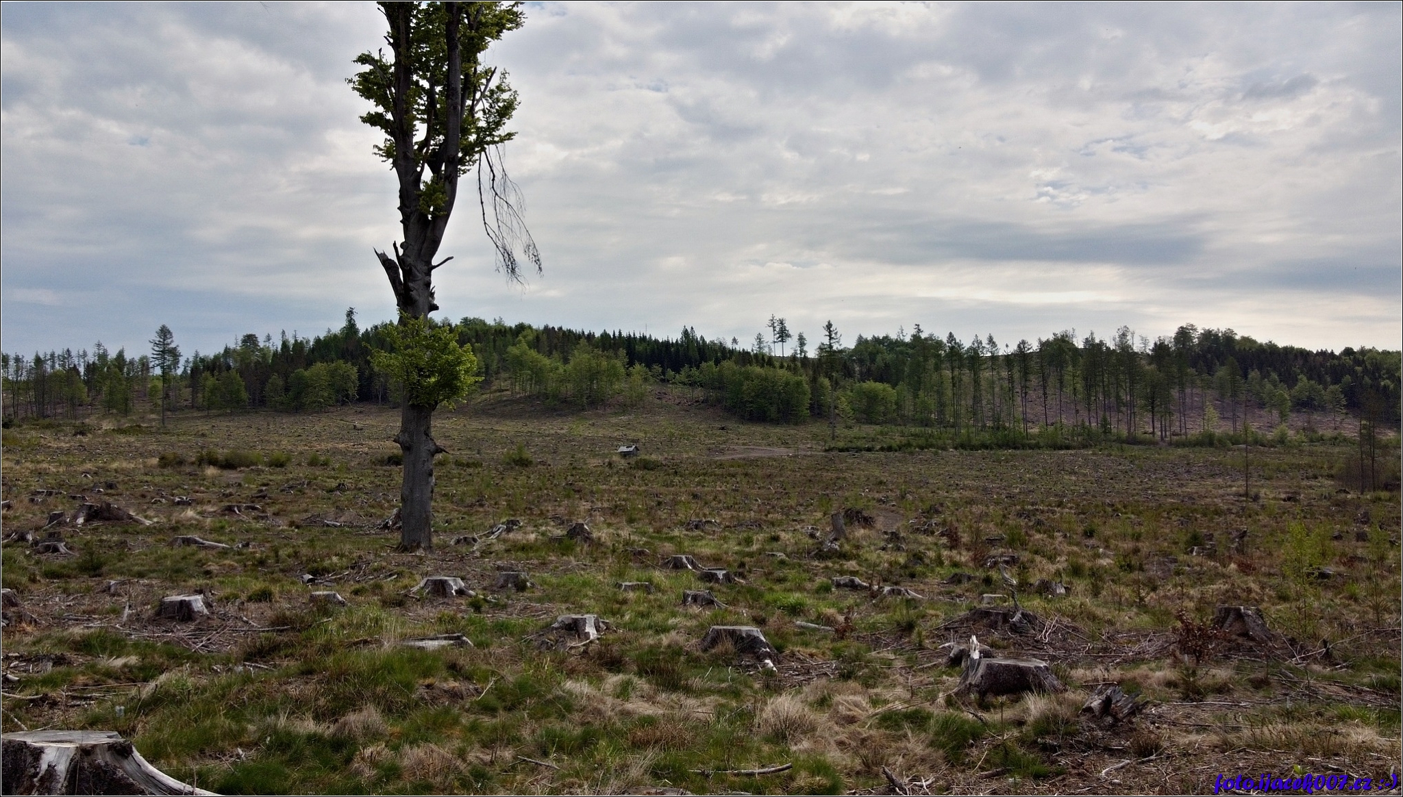 Strom v záběru jako jeden z posledních na místě kde ještě nedávno byl les.