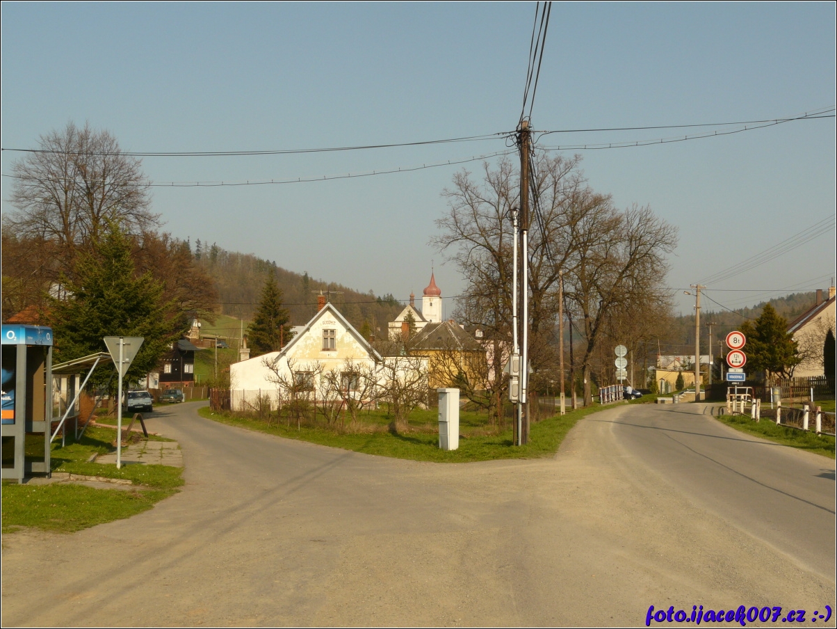 tíměř střed obce pohled na telefonní budku kostel i odbočku k obchodu