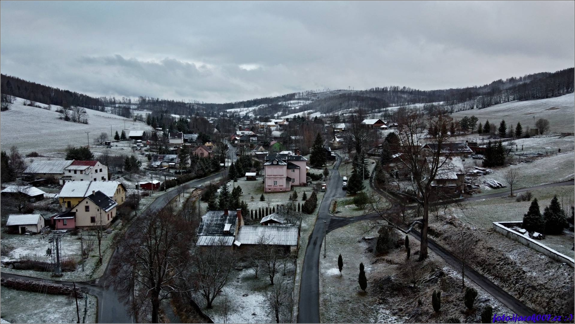Pohled na zasněženou obec Krasov