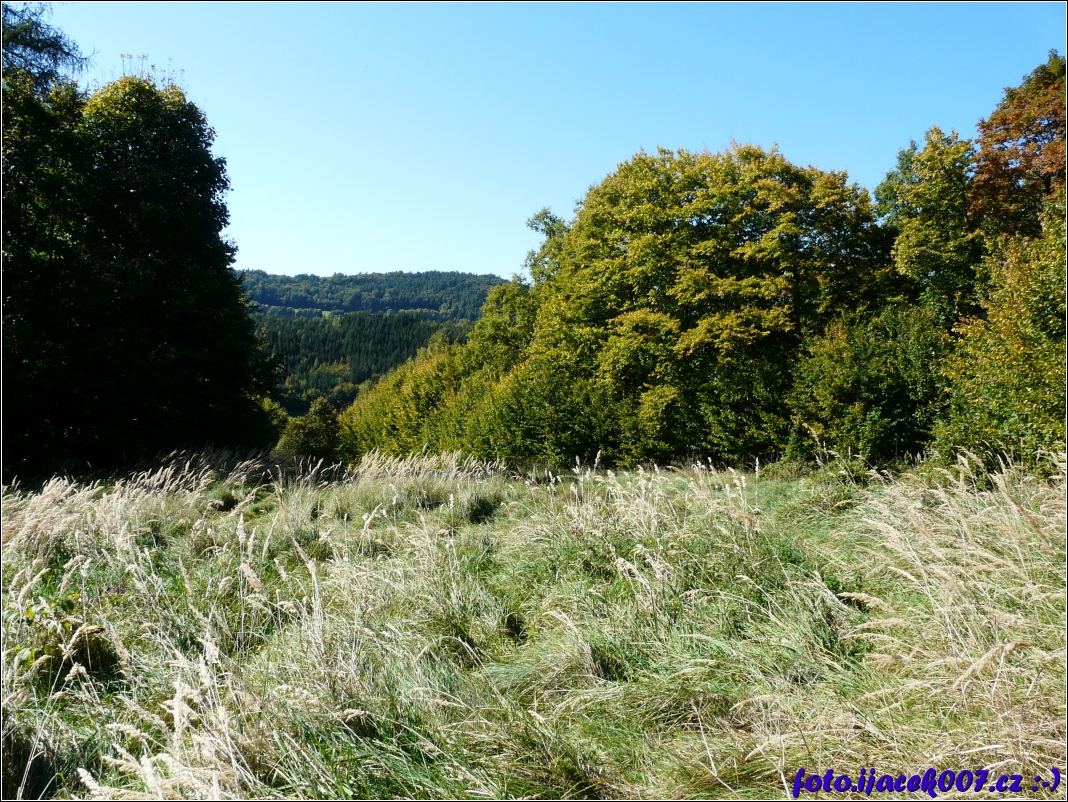 pohled na louku mezi stromy