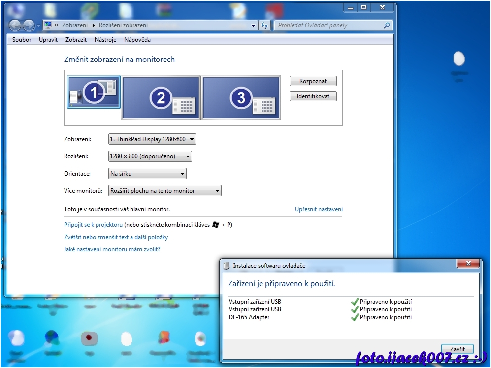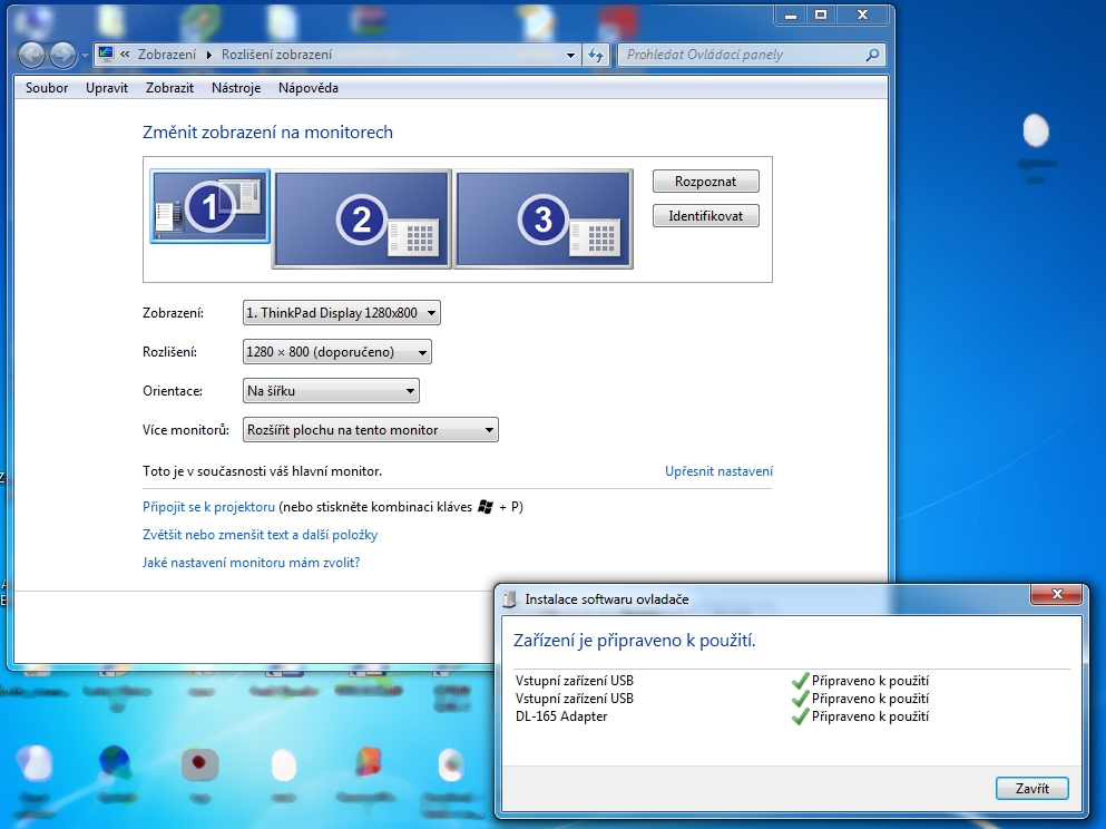 Pohled do nastaveni Windows 7 s připojeným 3 monitory . 1 je LCD noteboku 2 a 3 jsou full HD monitory Benq.