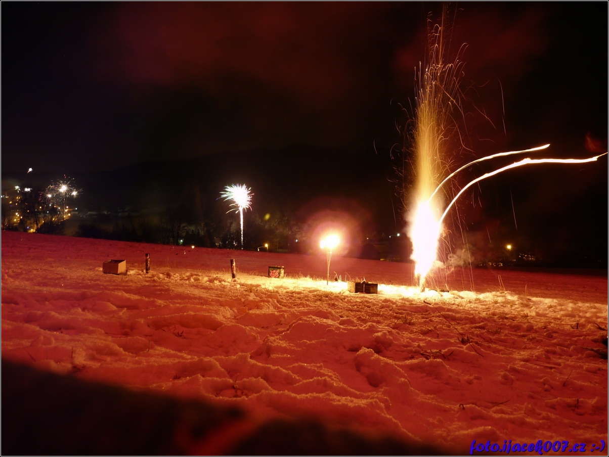 Fotografie malého ohňostroje v pozadí s další pyrotechnikou.