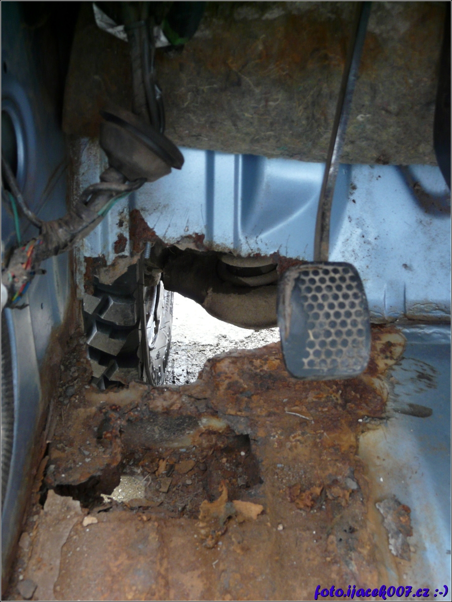 Pohled pod volant na spojkový pedál a dírou na přední levé kolo.