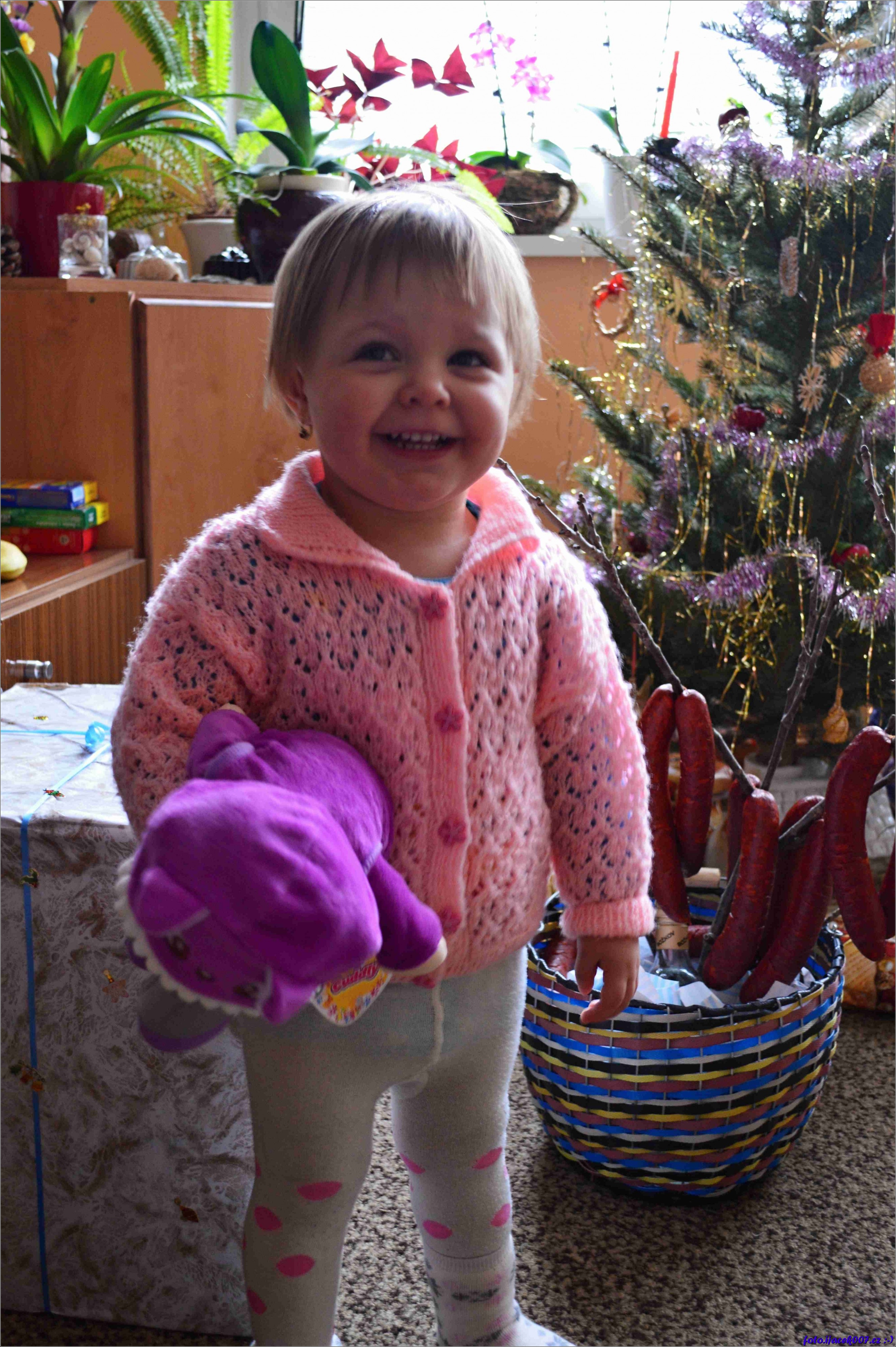 v pozadí dědův dárek a tetin stromeček