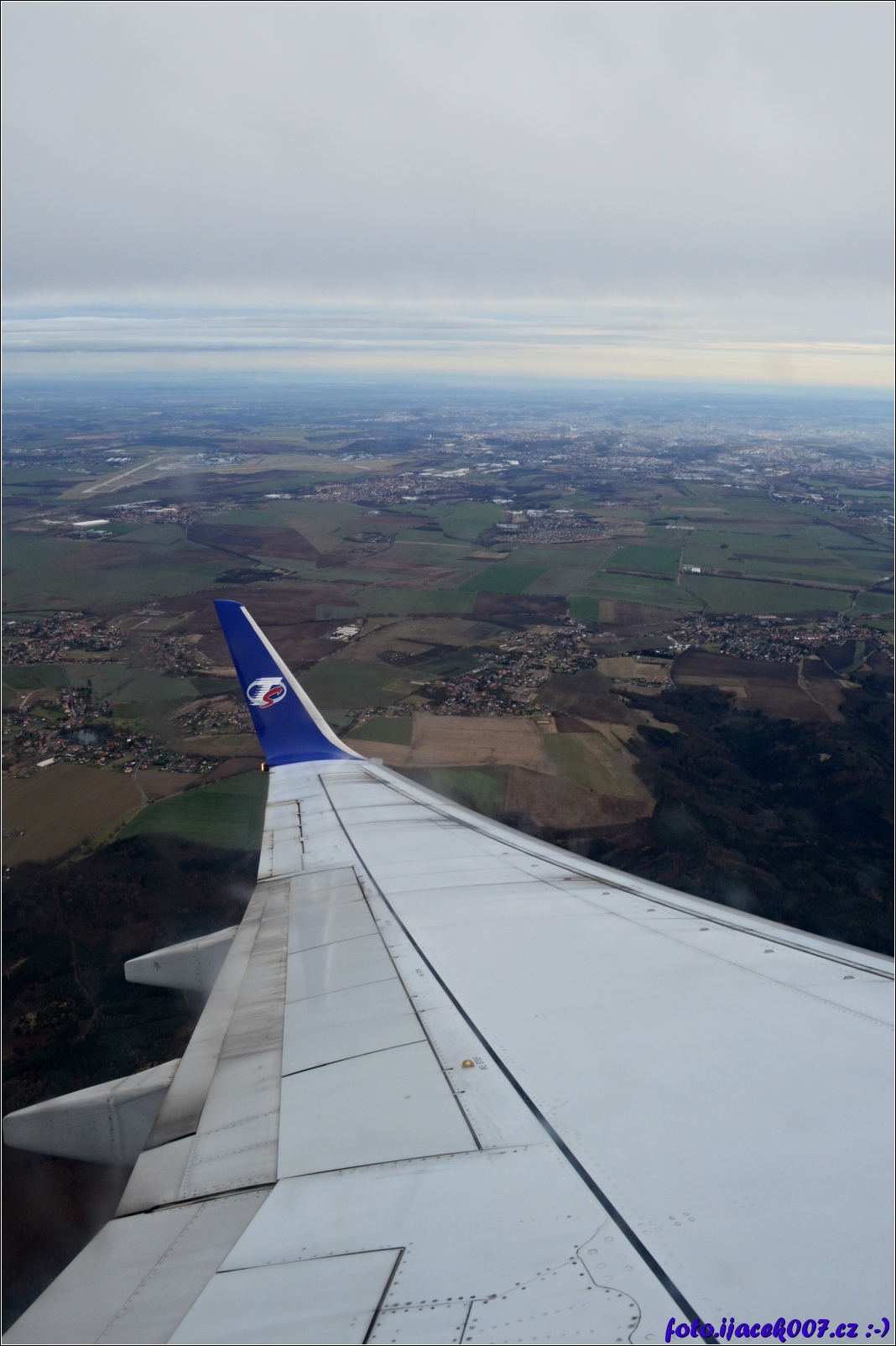pohled na vzdalující se zem a křídlo