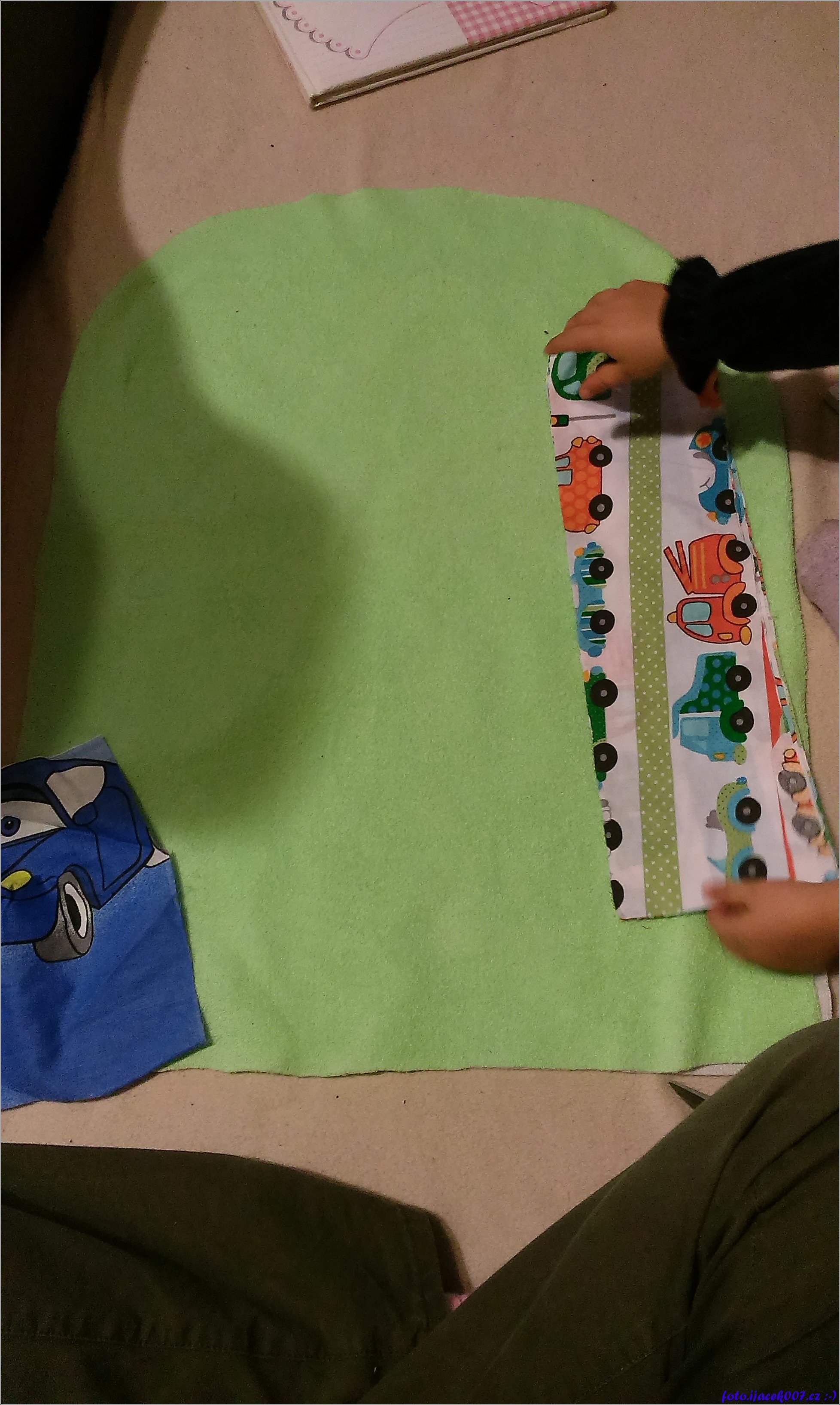 Na hlavní nosnou část přijdou pruhy látky které budou tvořit kapsy.