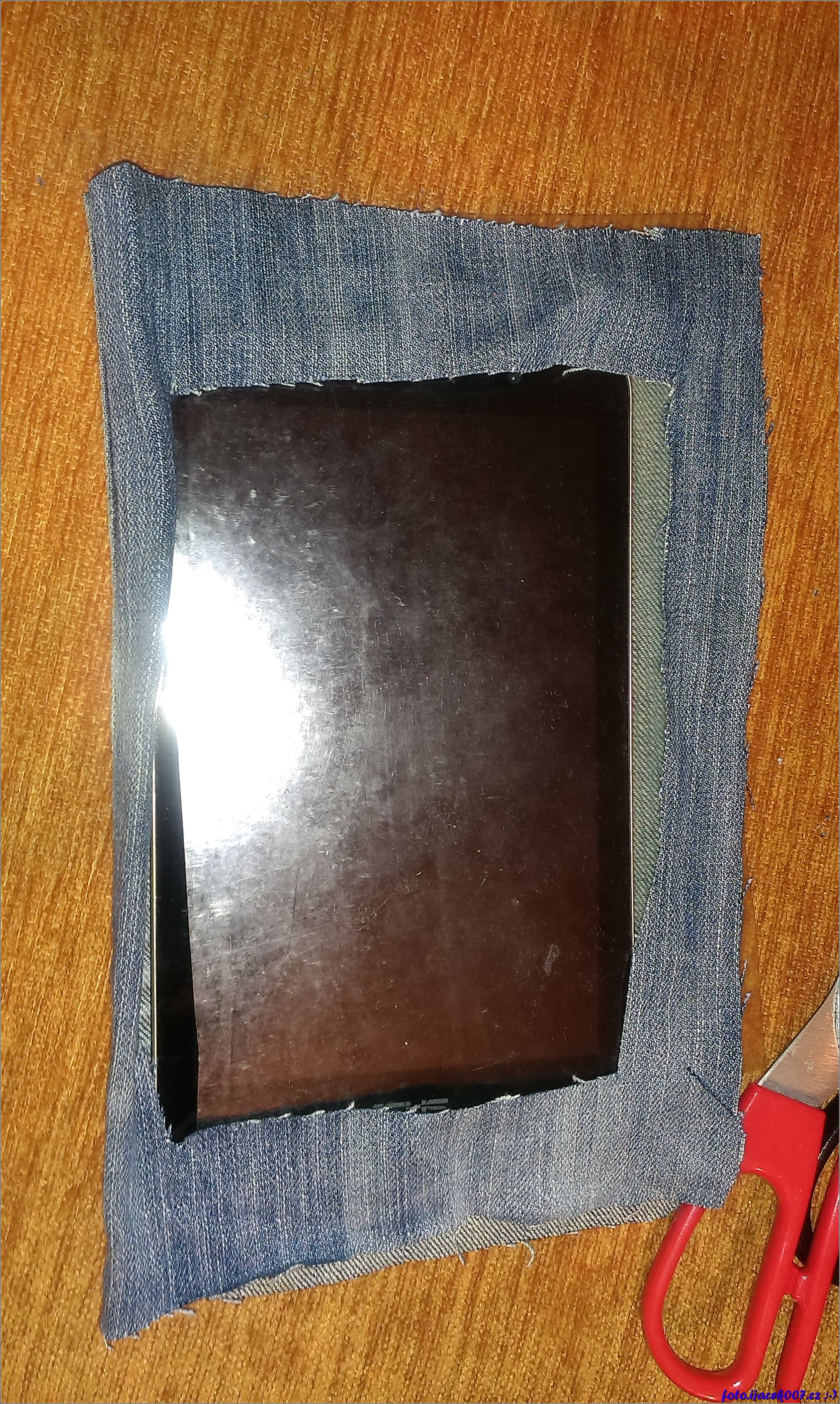 Vystřižené okno v nohavici pro display tabletu.