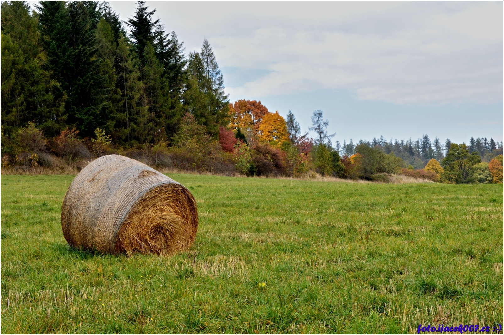 pohled na balík slámy uprostřed louky u lesu
