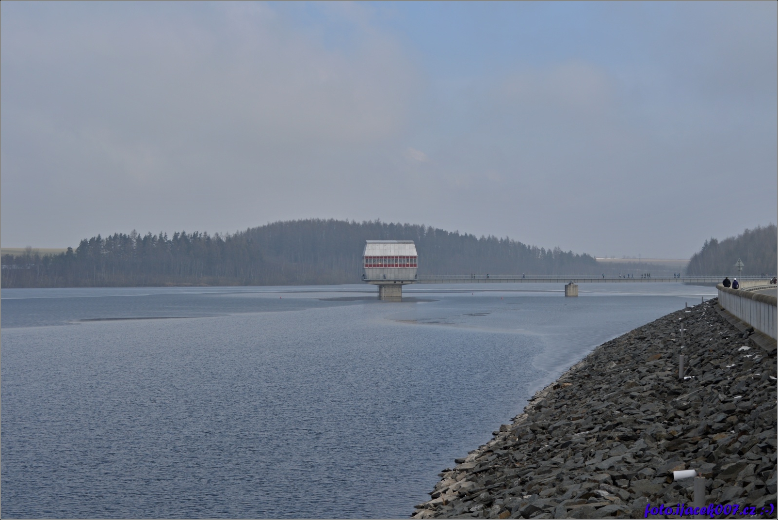 pohled z hráze na budovu nad vodou