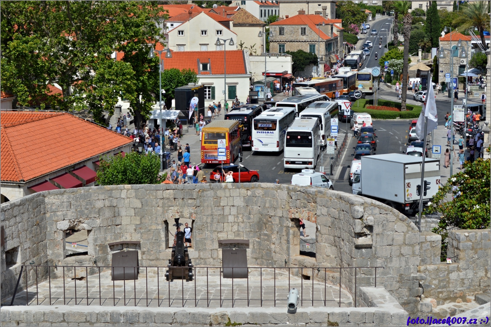 Pohled na davy turistu i autobusů je možné vidět z hradeb okolo Dubrovníku.