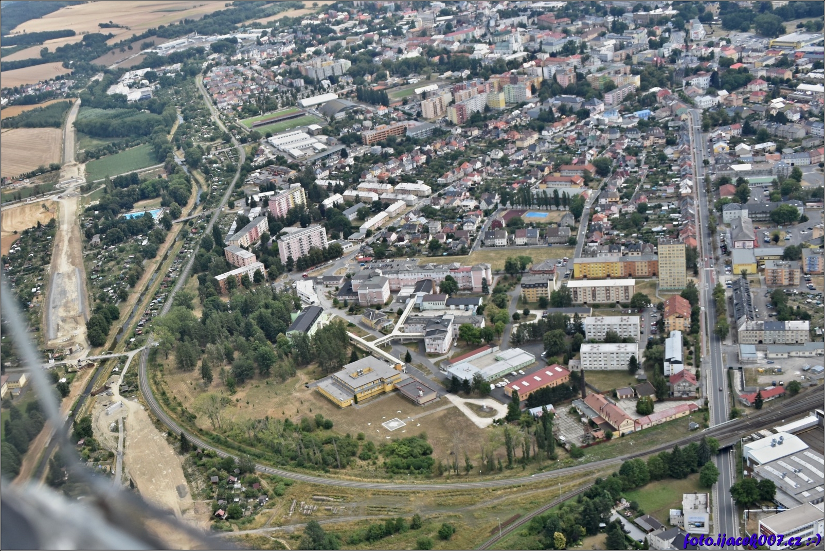 Pohled na krnovskou nemocnici ale také na stavbu obchvatu.