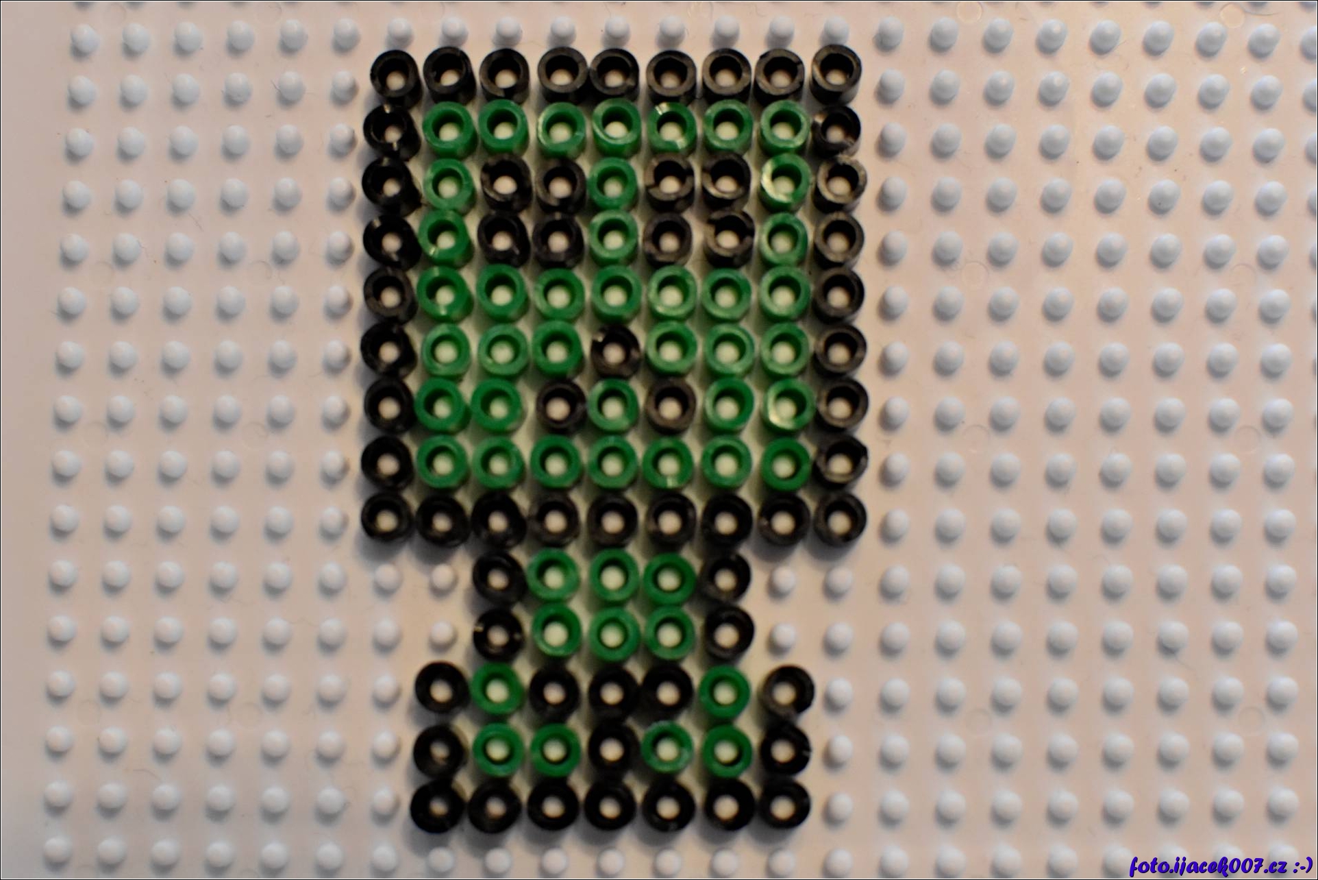 Postavička Creeper ze hry Minecraft složená z korálku Pyssla.