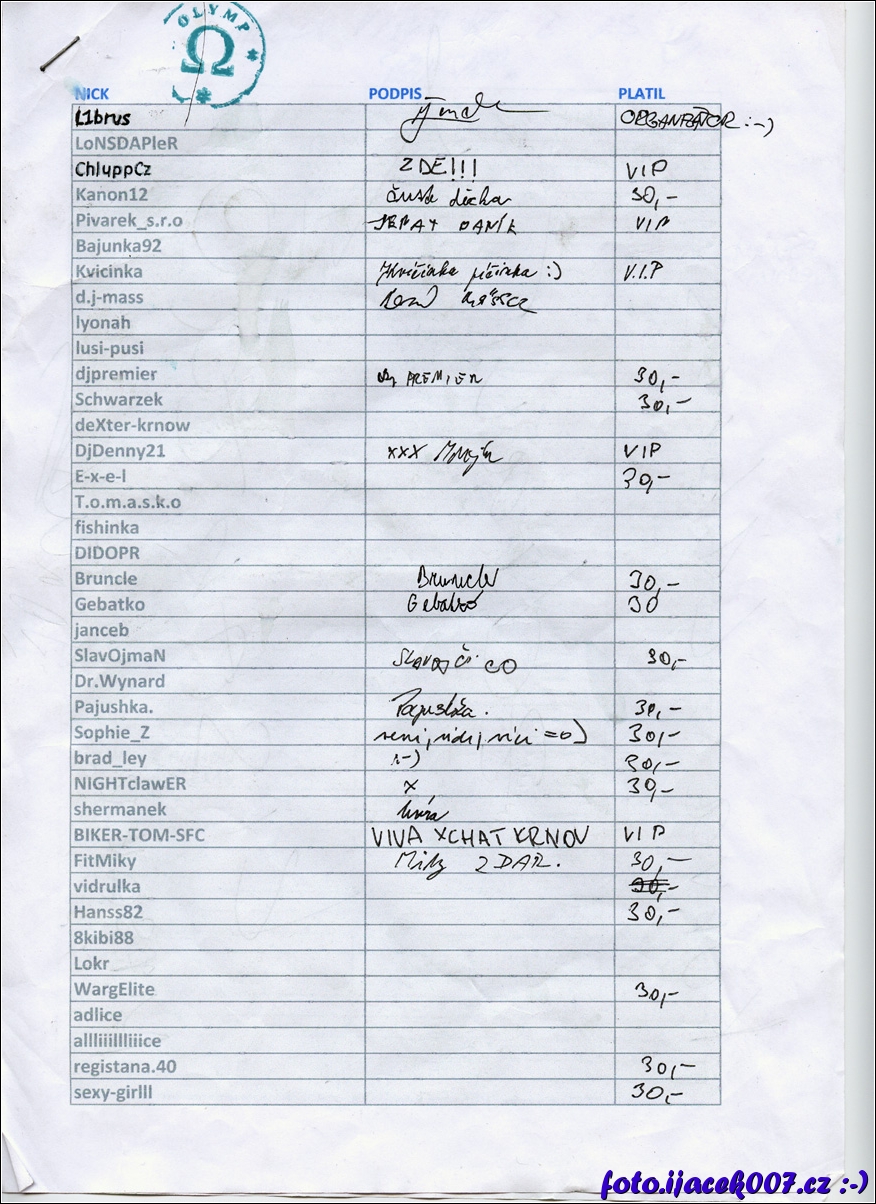Seznam lidi kdo přišel kdo se podepsal a kdo platil vstupne čast 1/2