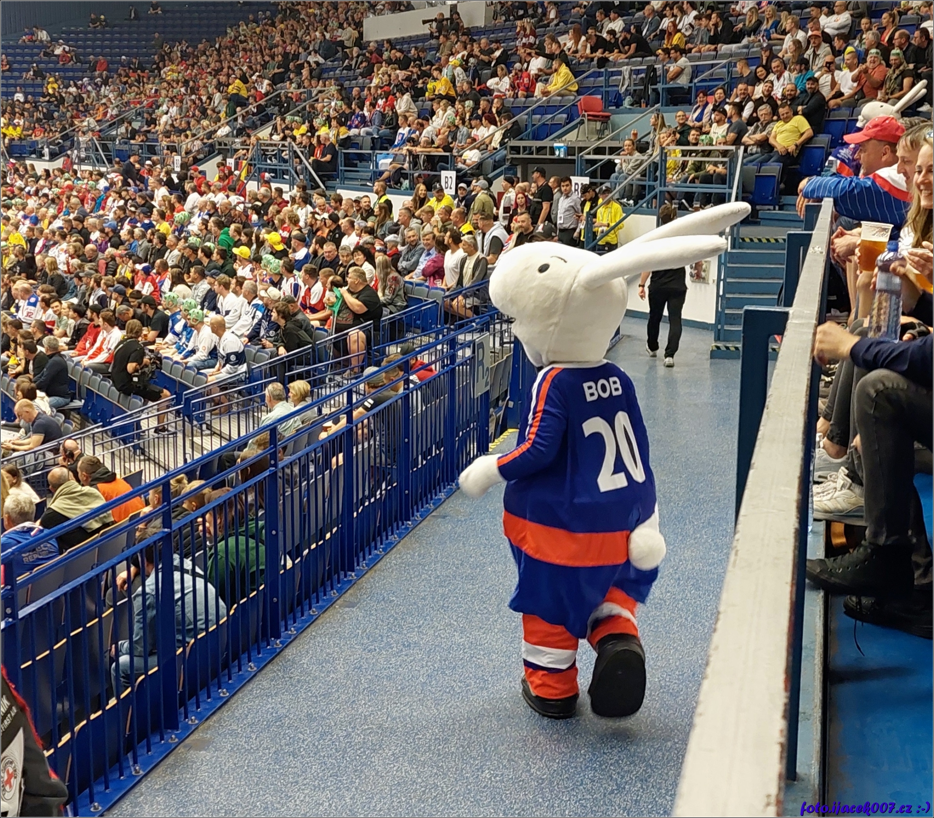 Pohled na tribuny na maskota podporující atmosféru fanoušků.
