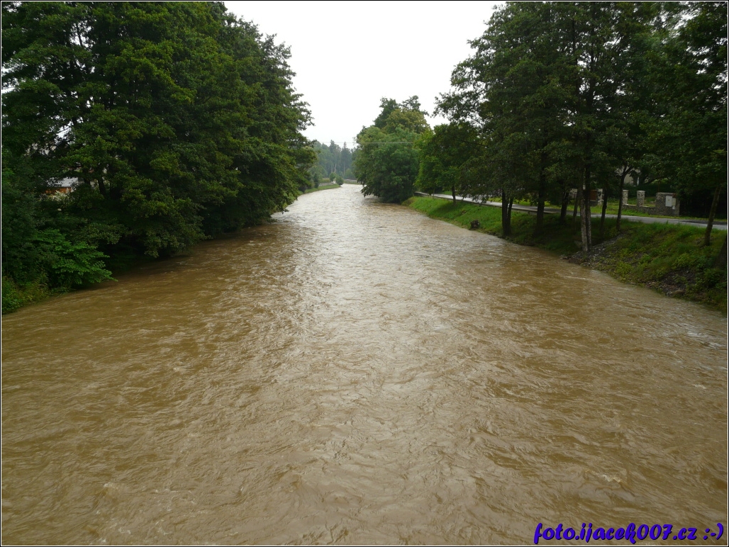 Pohled po proudu řeky v kostelci v dali jsou vidět protipovodnové stěny vystavěné po povodni v roce 1997