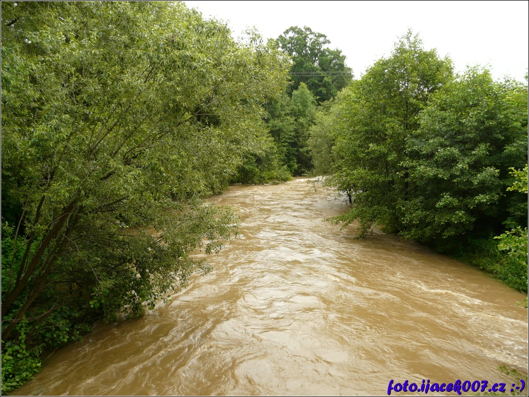 Pohled s proudem směr Krnov 1 povodnový stupeň.