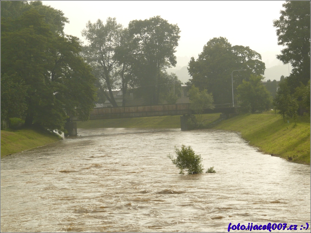 Pohled s proudem na řeku Opavu v dali železniční most spojující Krnovské nadraží cvilin s Opavou.