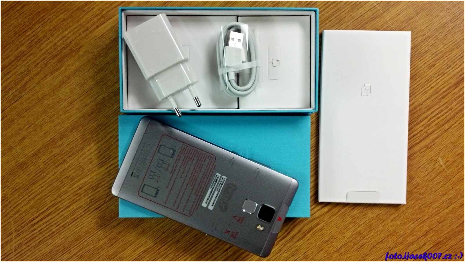 krabička s přístrojem pohled na usb kabel a nabíječku.
