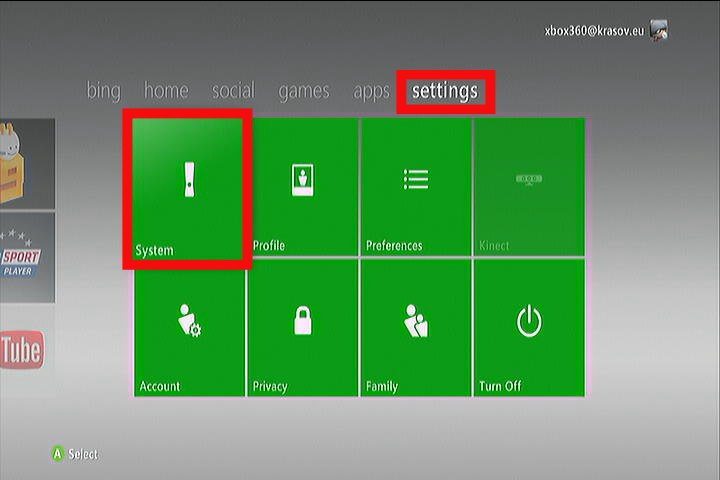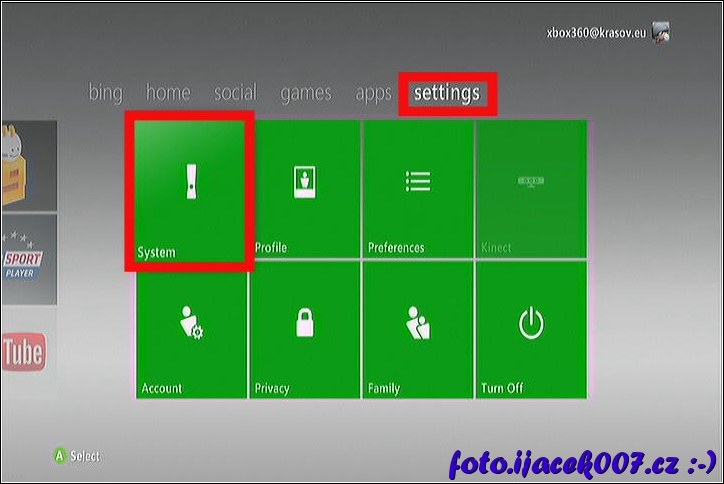 karta nastavení a volba položky systém