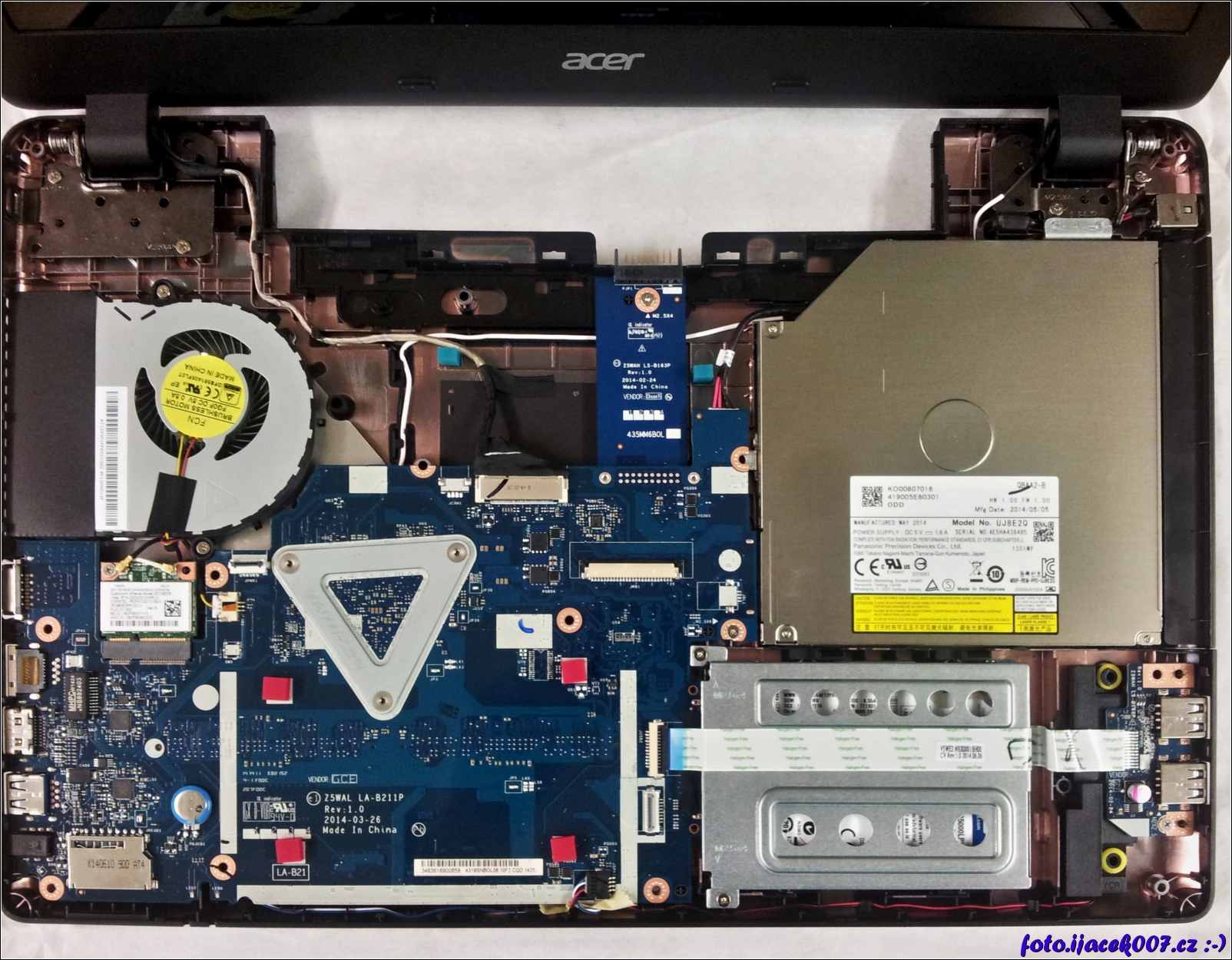 pohled do vnitřku notebooku na základní desku chladič cpu a dvd mechaniku