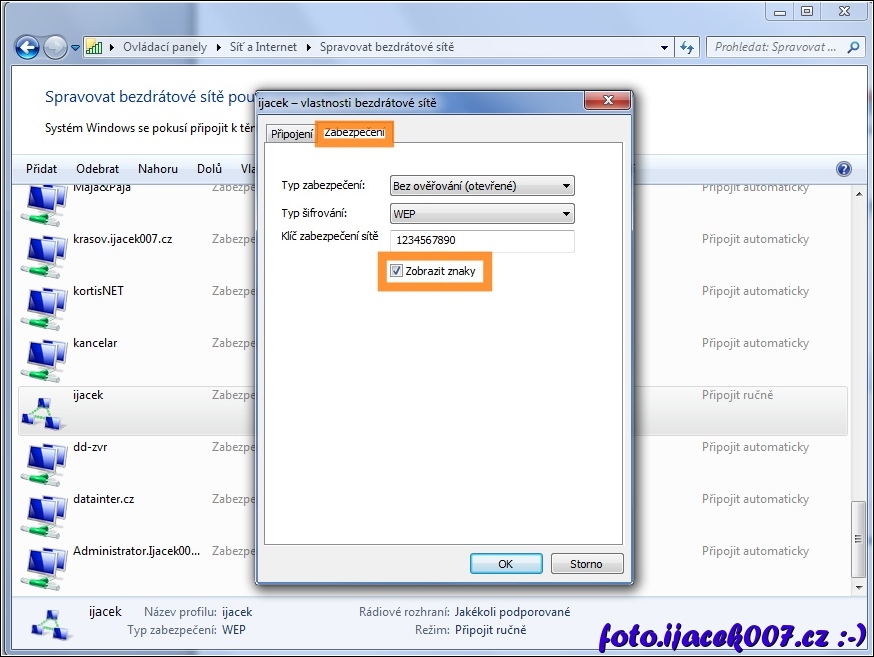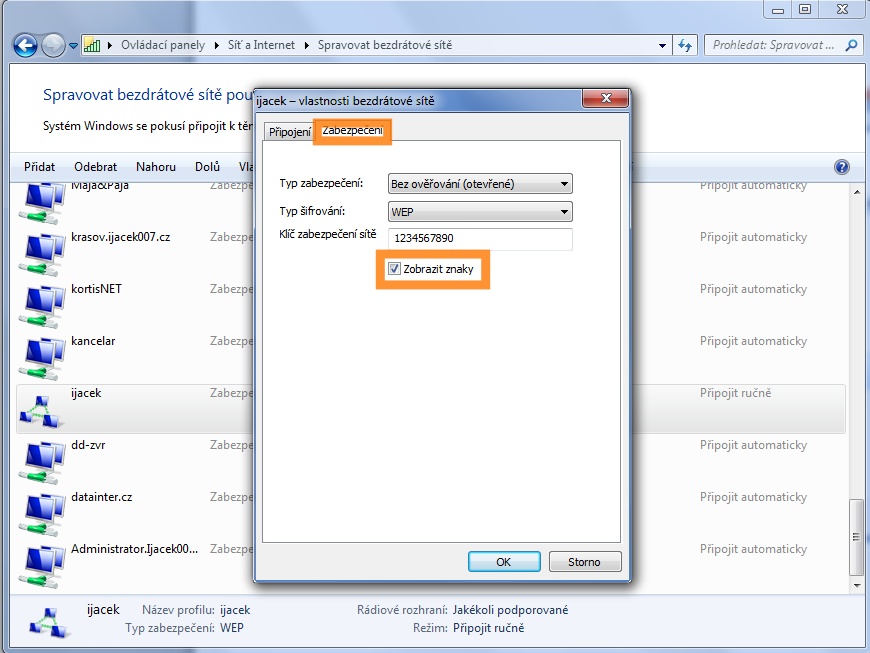 karta vlastností bezdrátové sítě panel zabezpečení zobrazit heslo