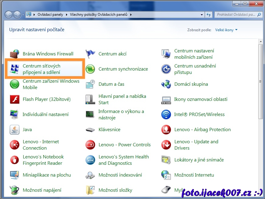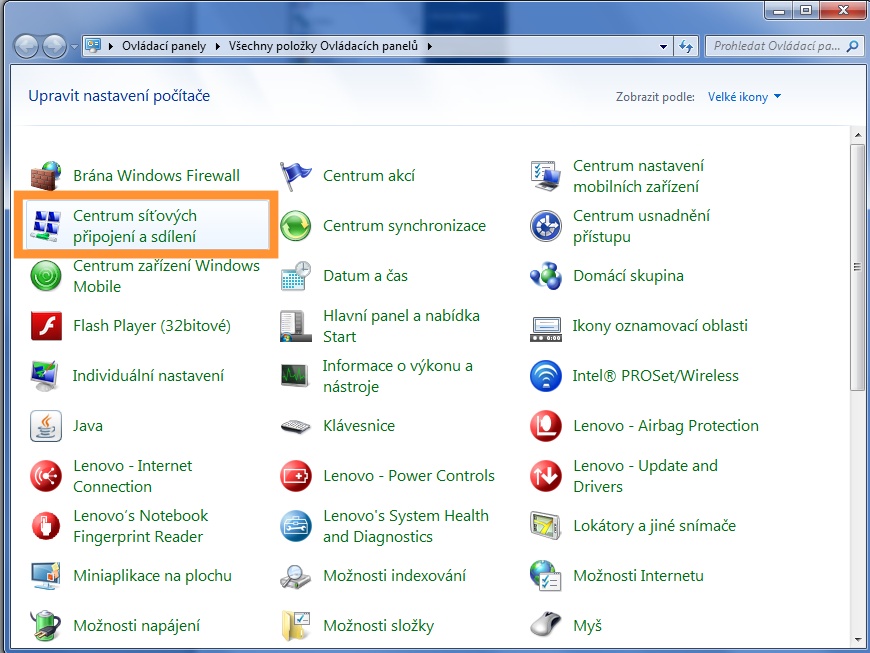 Položka centrum síťpvých připojení ovladací panely Windows 7