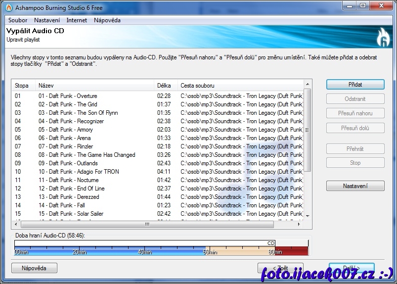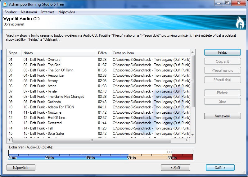 seznam vložených písní či audio souboru