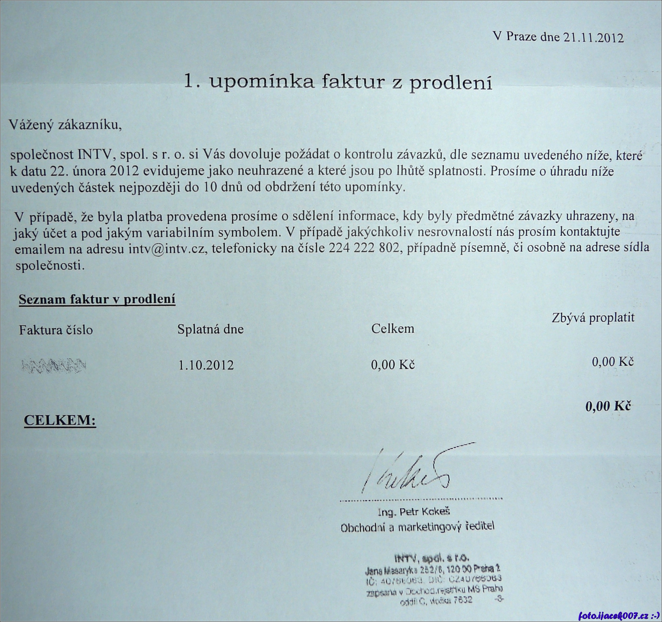 1. Upomínka na 0 kč