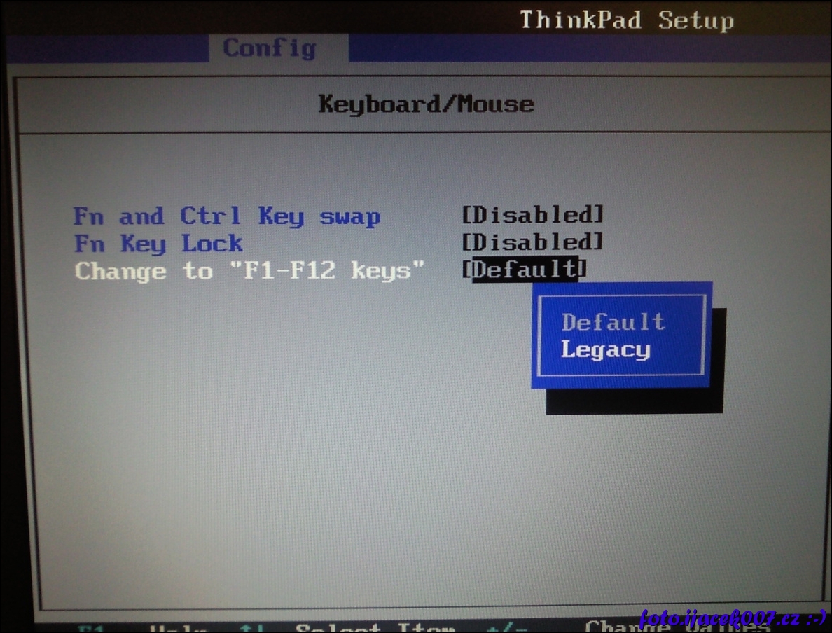změna nastavení klávesnice na Legacy tedy na funkčnost standardních tlačítek F1 - F12