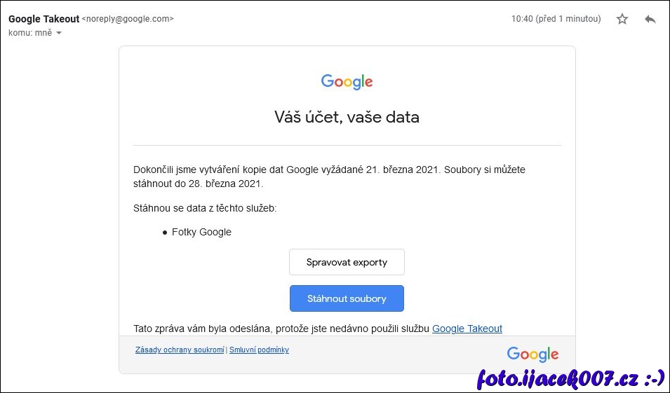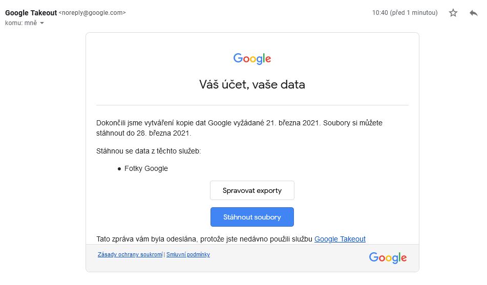 Email informující o vygenerovaném exportu dat