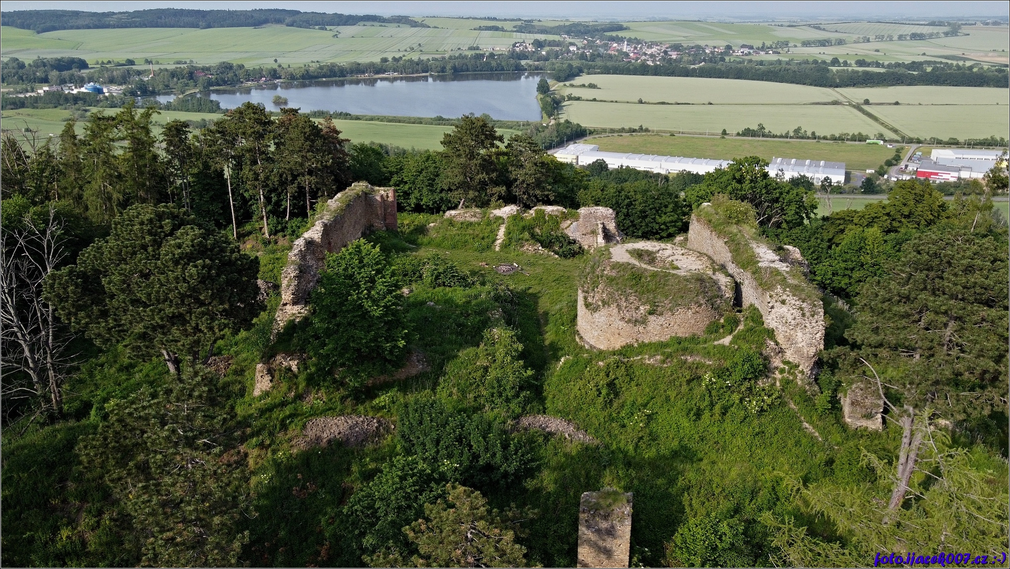 Pohled na Petruv rybník průmyslovou zonu i na zříceninu hradu Cvilín.