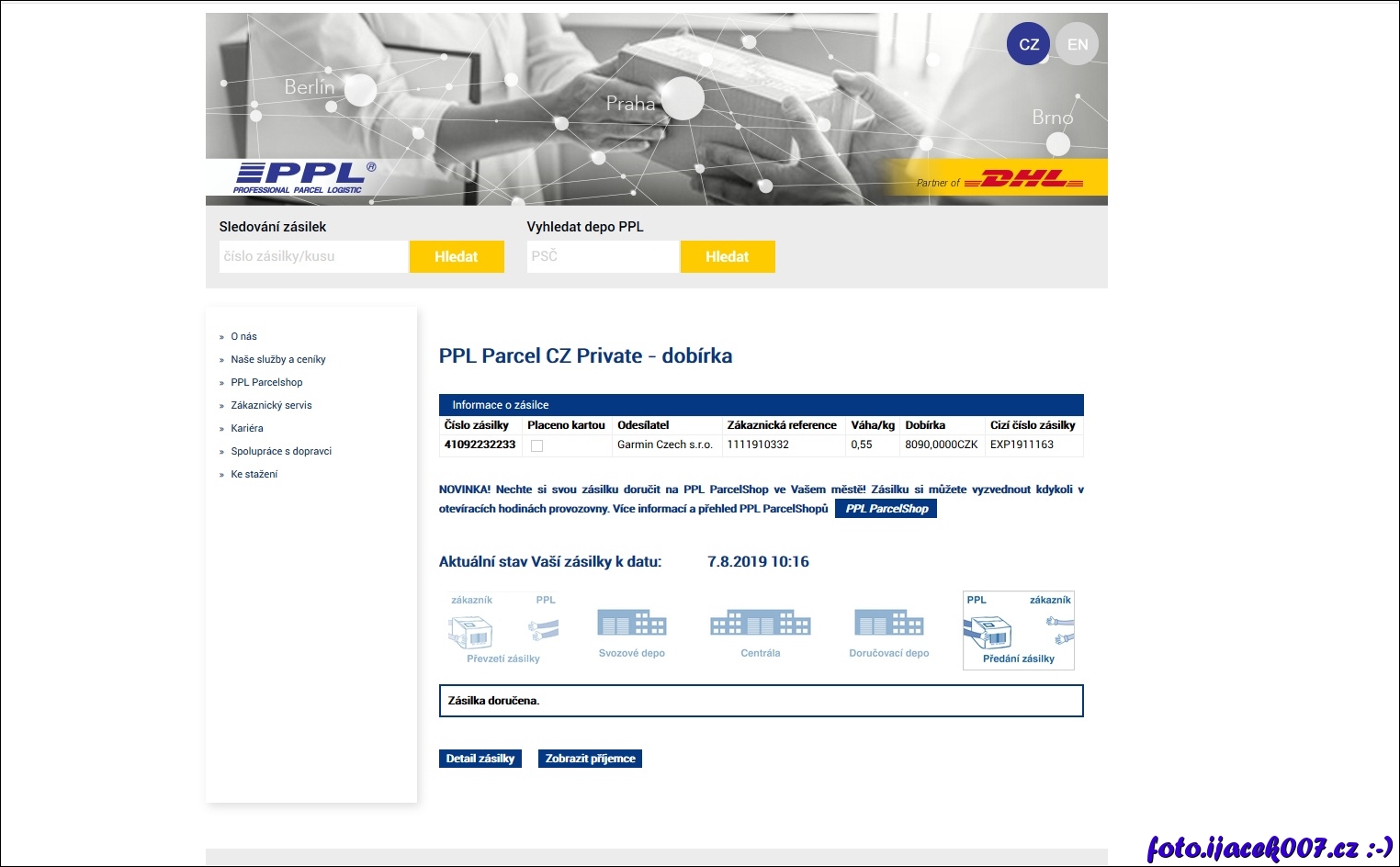 Informace o přepravě pomocé PPL a dobírky