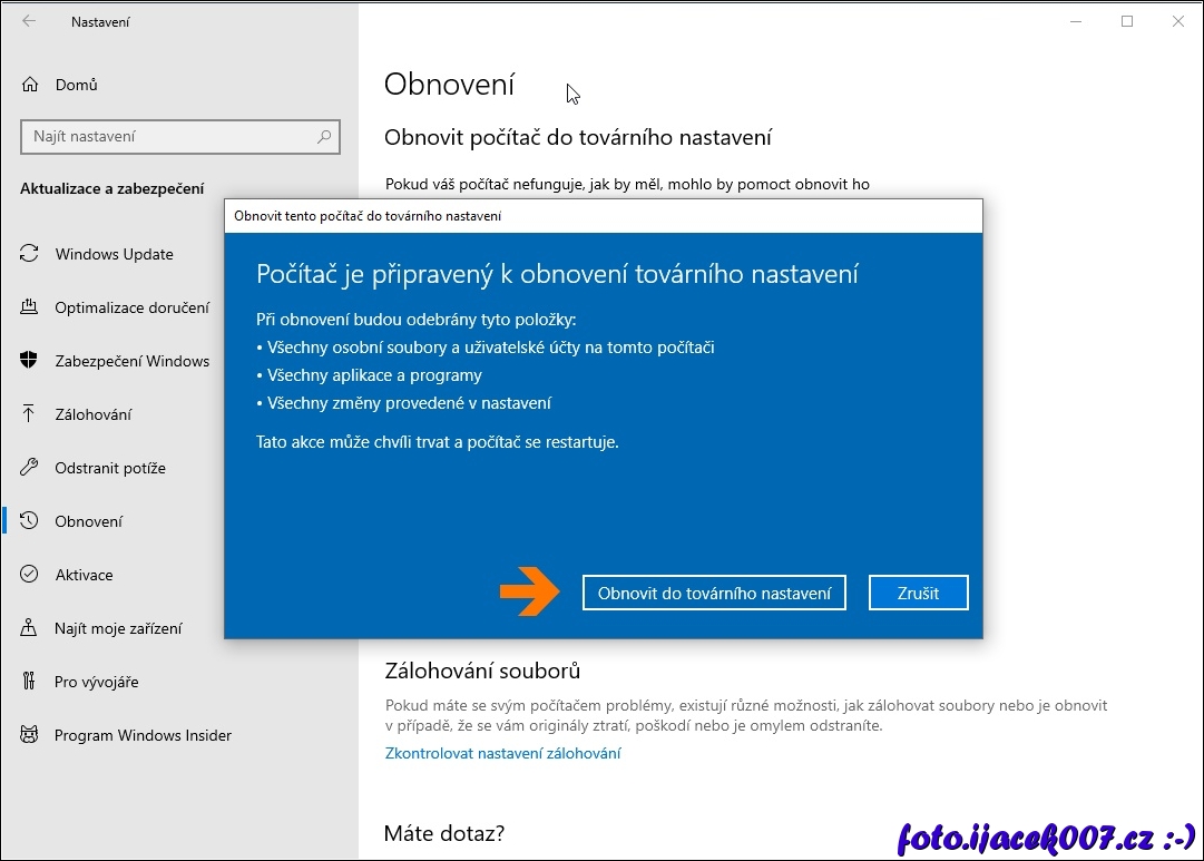 Windows 10 nastavení obnovit počítač do továrního nastavení