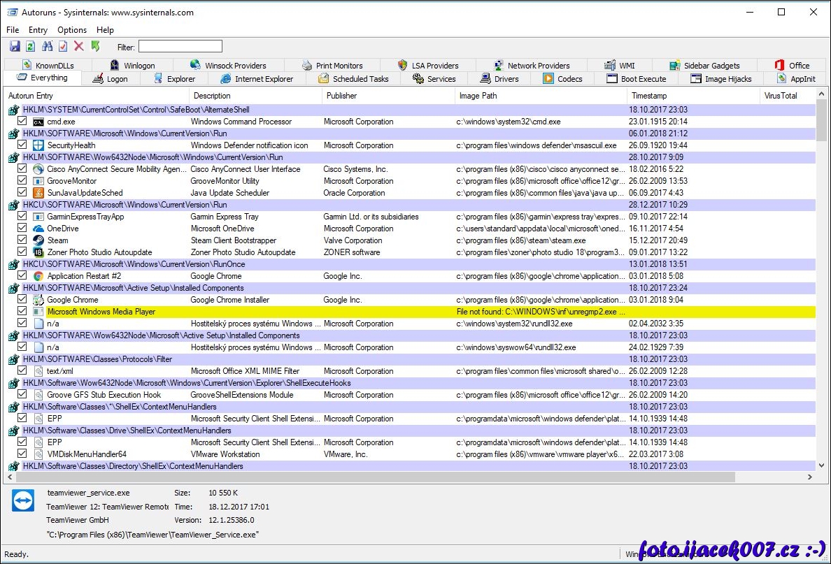 pohled na rozhraní programu autoruns firmy sysinternals