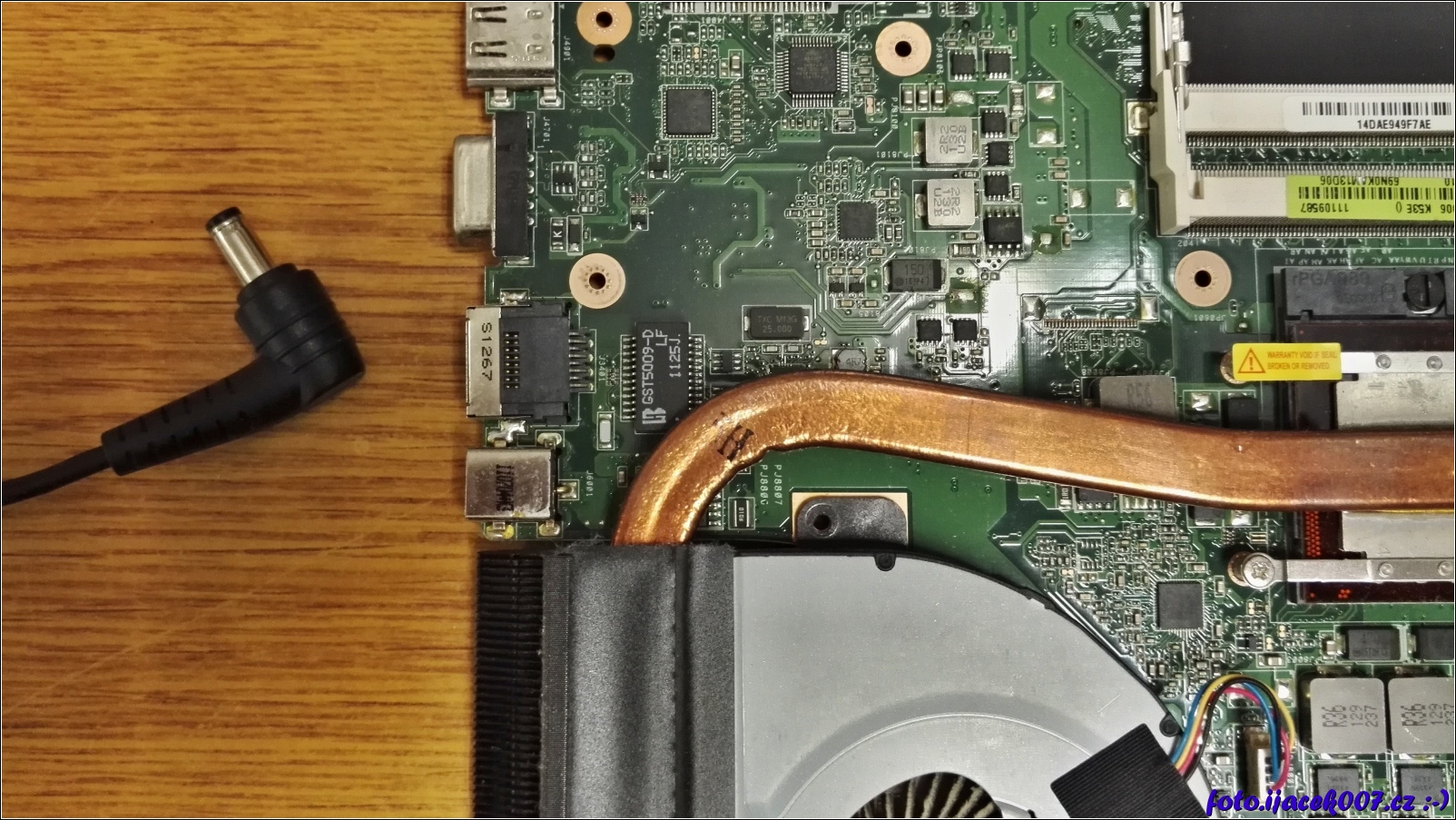 pohled na demontovanou zakladni desku z notebooku a napajecí konektor