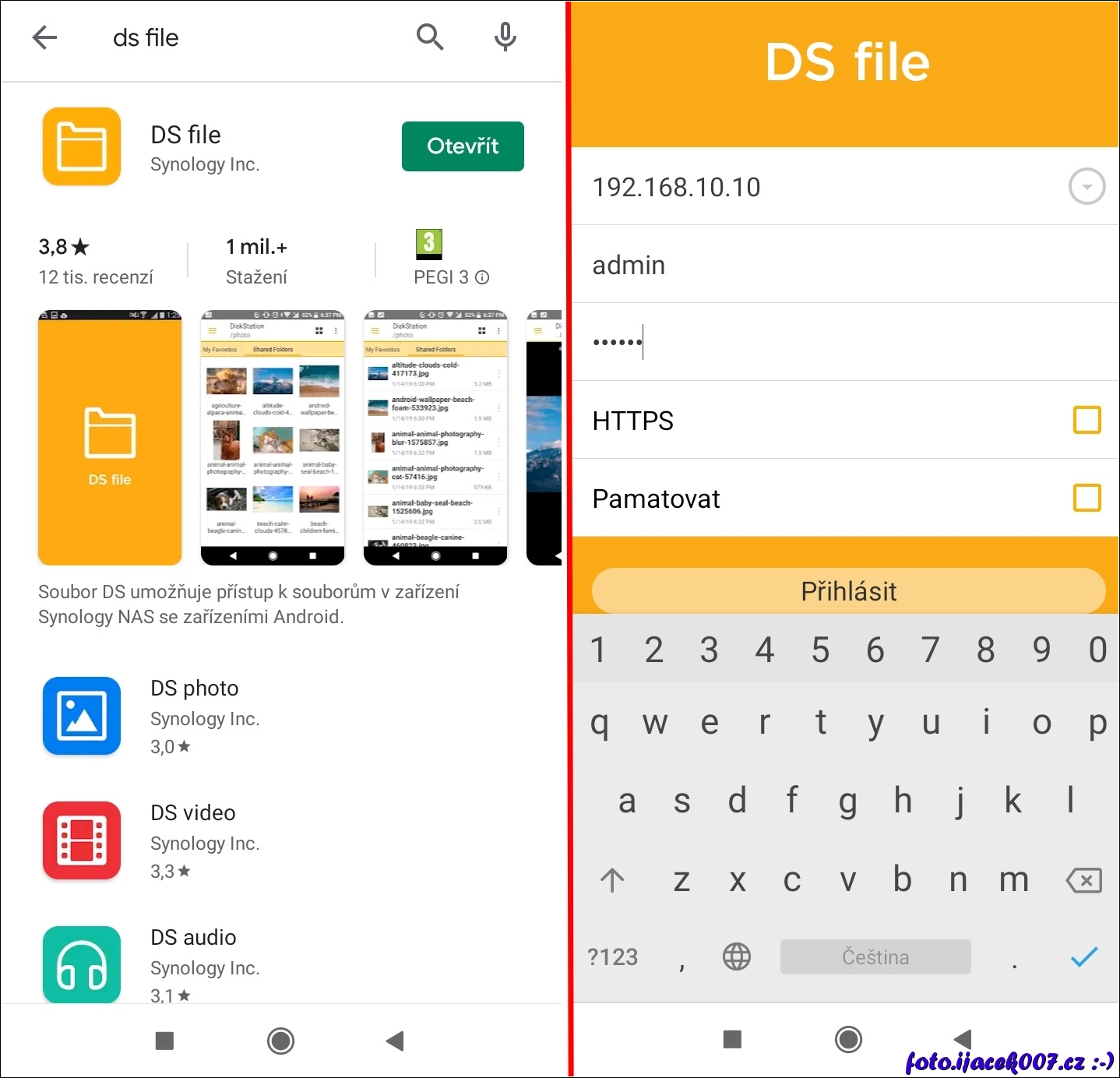 Obrazovky aplikace Android DS-File stažení a první instalace.