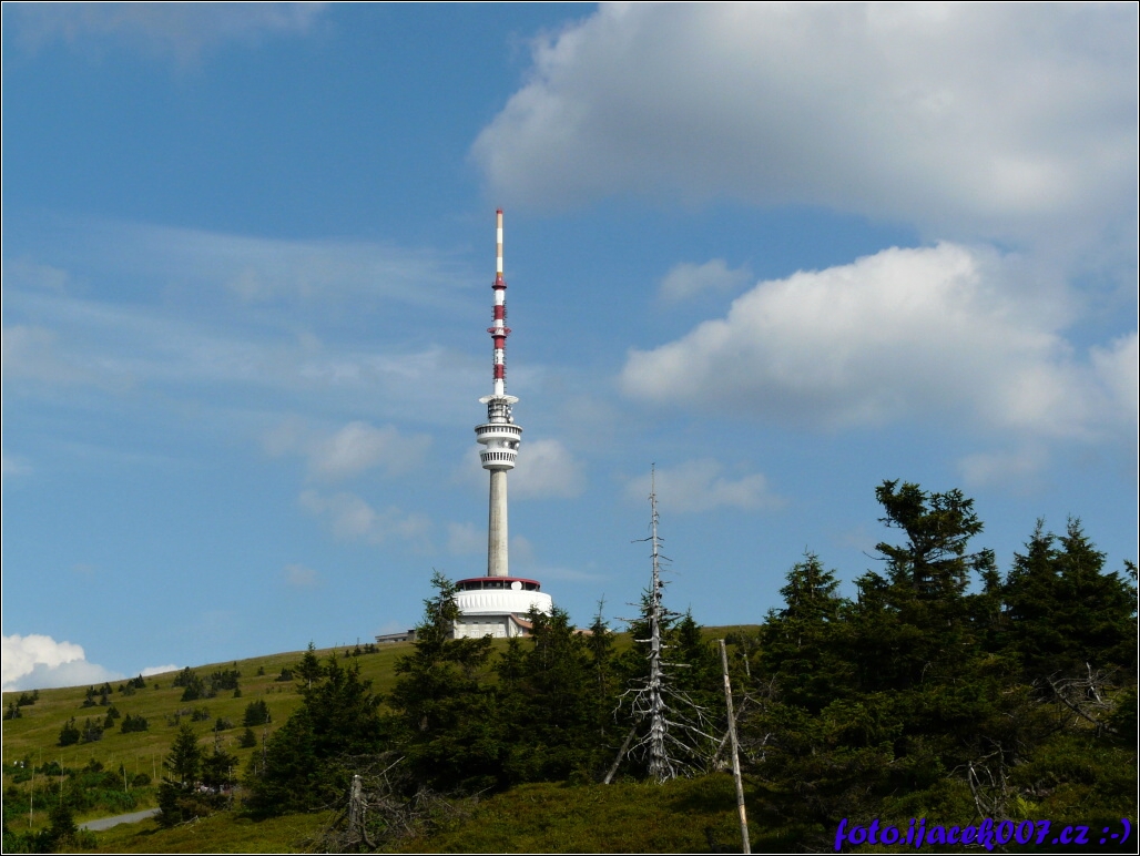 Pohled na vysílač s vyhlýdkovou terasou na vrcholku praďedu.