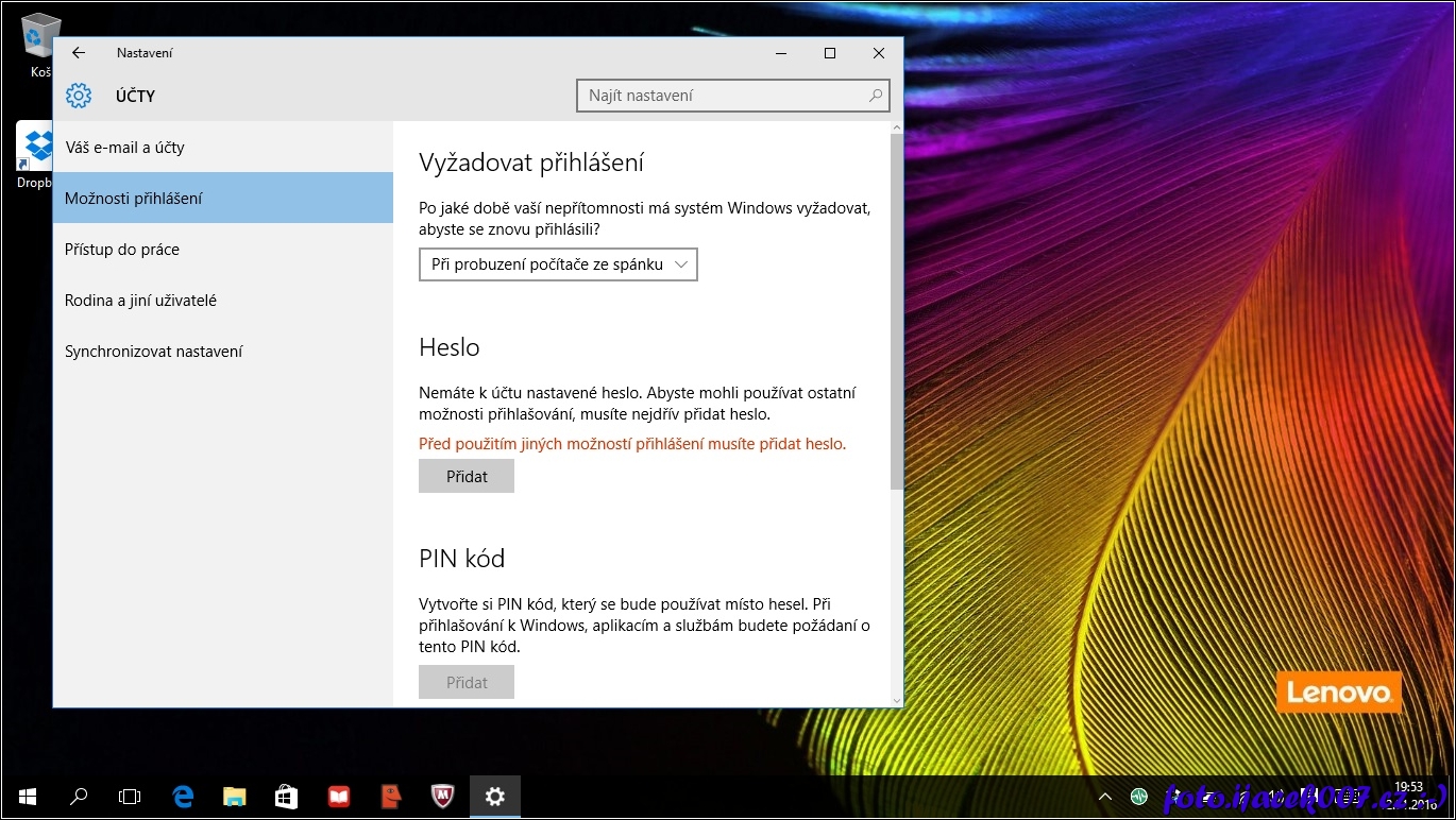na obrazovce je vidět že v tuto chvíli není nastavené heslo k účtu.