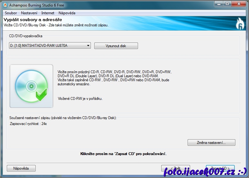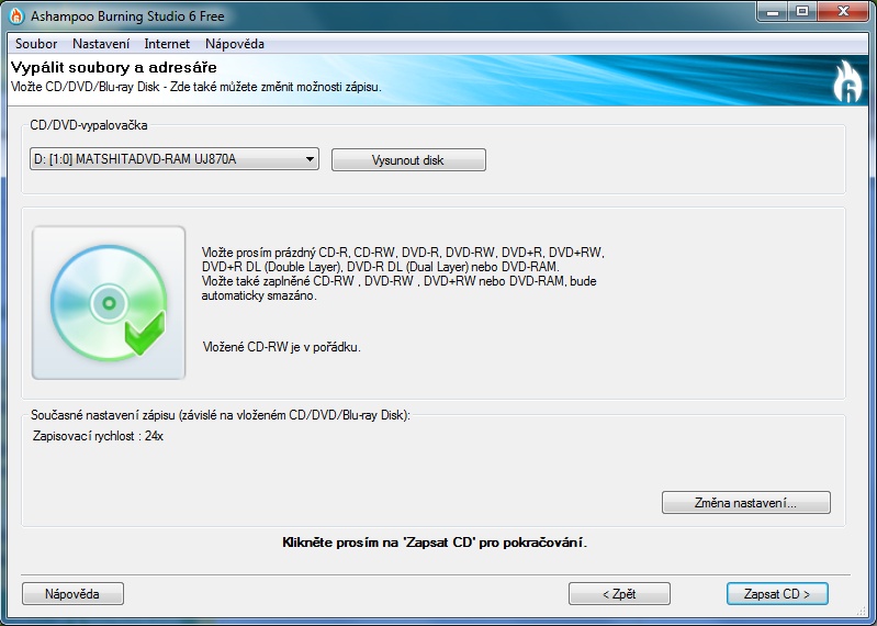 vložený disk je v pořádku můžeme data vypálit