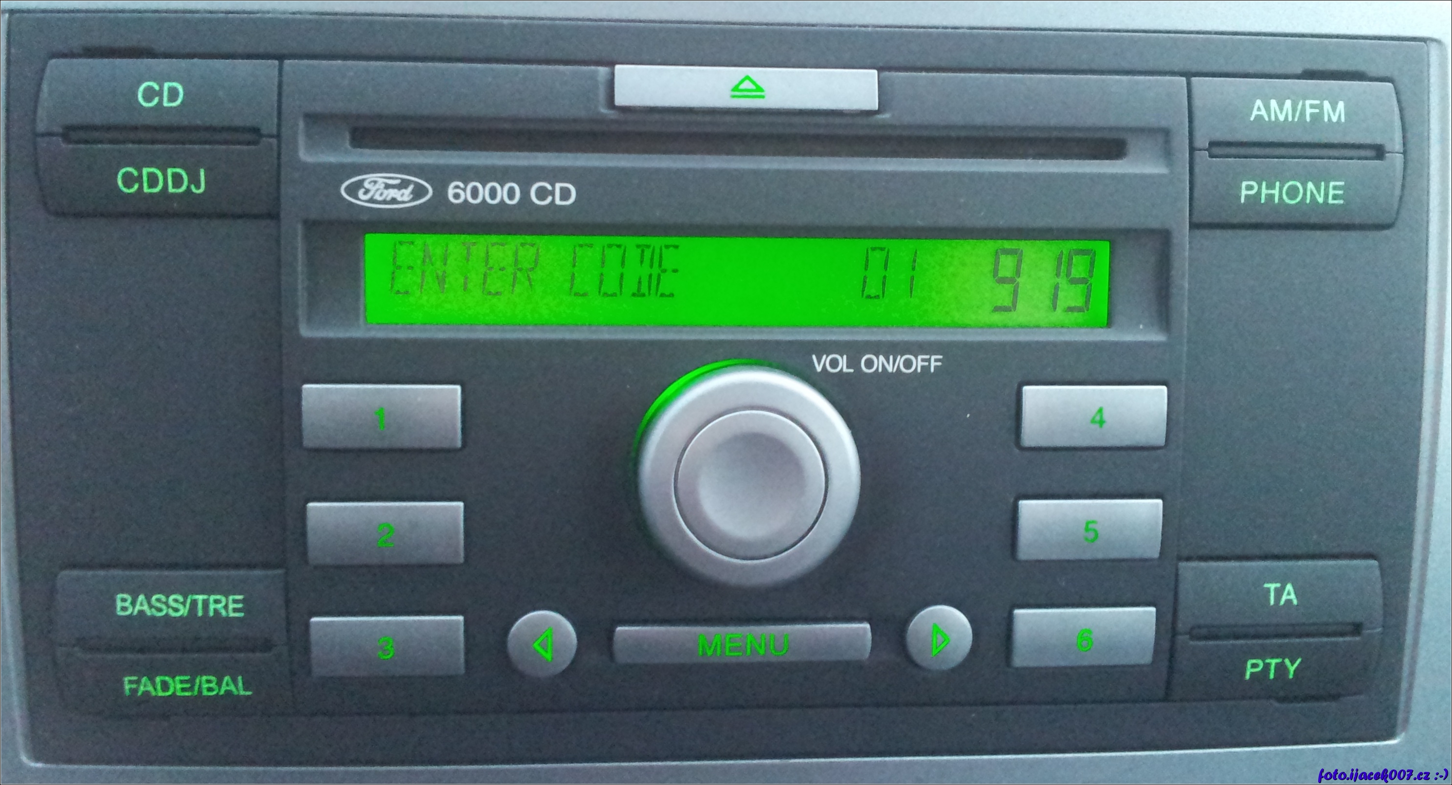 Pohled na čelní panel autorádia 6000CD a výzva o vložení odemykacího kodu.