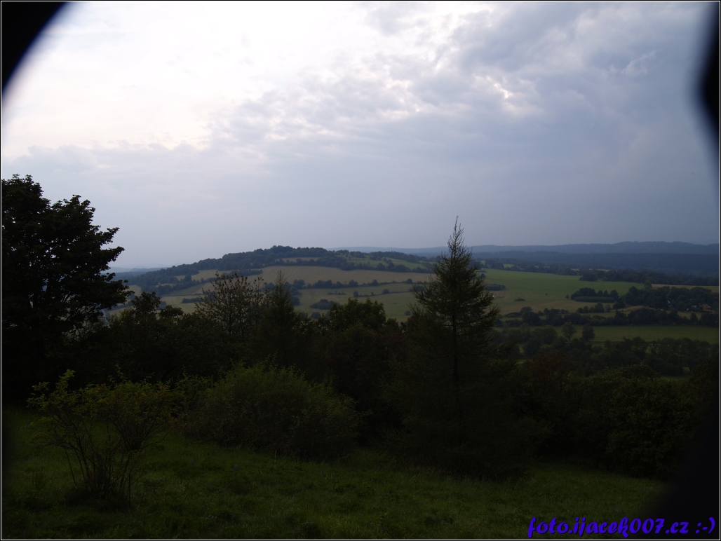 pohled na vrcholky kopce posetého vegetací a výhled do dálky