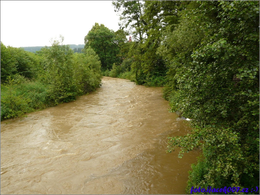 Pohled proti proudu směrem k zátoru foceno z mostu v Branticích
